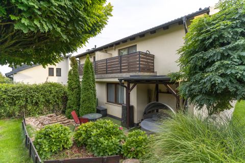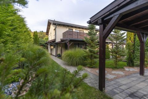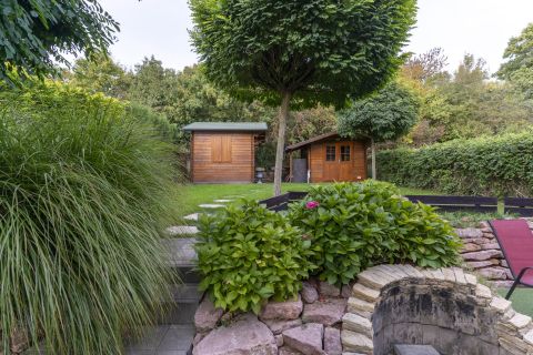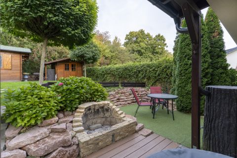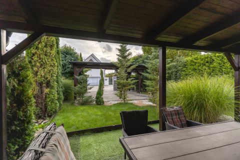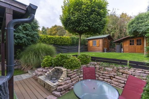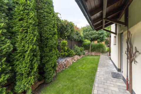 A ház egyik legnagyobb ékessége a gondosan megtervezett és karbantartott kert, amely a tulajdonos igényes munkáját tükrözi.