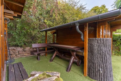 A kertben található két faház (egy 3×3 m-es tároló és egy Hőszigetelt 4×3 m-es, villannyal és vízzel ellátott prémium kivitelű) funkcionális és esztétikai értéket is ad, tökéletesen illeszkedve a természetes környezethez.