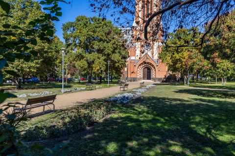 A DK-i tájolásnak köszönhetően a lakás egész nap fényárban úszik, az ablakból pedig a templom teteje és a fák lombjai látszanak – egy igazán békés, zöld panoráma a városhoz ennyire közel.