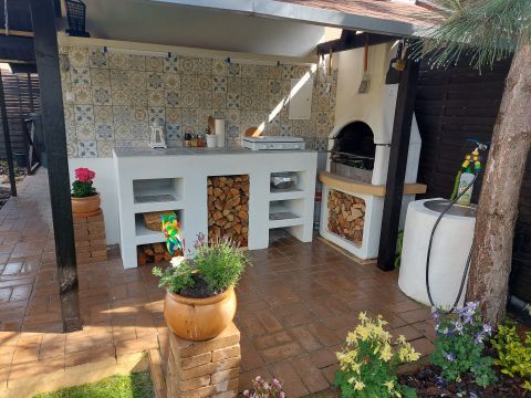 A nyári konyha, a beépített öntözőrendszer, valamint a két fából készült kerti tároló praktikus kiegészítői a mindennapoknak.
