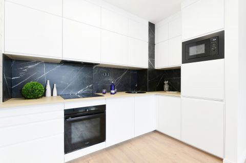 A konyhabútor matt fehér és matt fekete színei modern és elegáns megjelenést adnak, teljesen gépesített, indukciós főzőlap, sütő, mosogatógép, beépített hűtő, mikró.