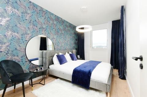 A lakás délnyugati tájolású, a hatalmas üvegfelületeken árad be a napfény.