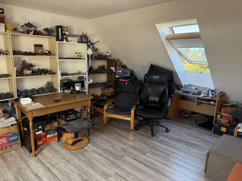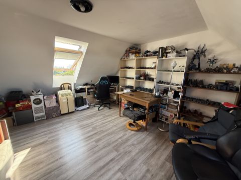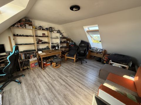 A tulajdonosok az idők folyamán beépítették a tetőteret, brutto 25 m2-rel növelve a használható lakóteret, bár a ház ura ezt jelenleg irodaként használja. Mindkét szinten található WC, a fürdőszoba pedig az emeletre került. A konyha külön kapott helyet, míg a nappaliban került kialakításra az étkező és innen lehet kijutni a fedett teraszra és a kertbe is.