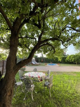 ÁPOLT, PARKOSÍTOTT KERT ÖRÖKZÖLDEKKEL, KIS GYERMEKMEDENCÉVEL: