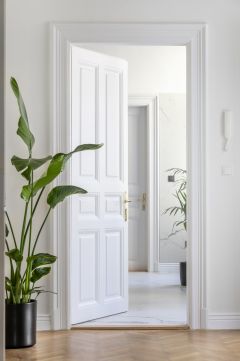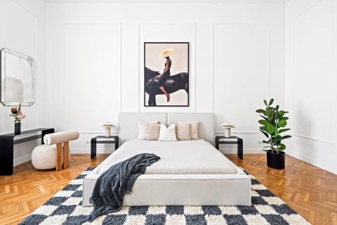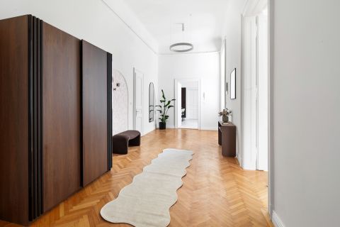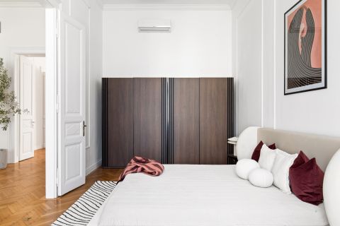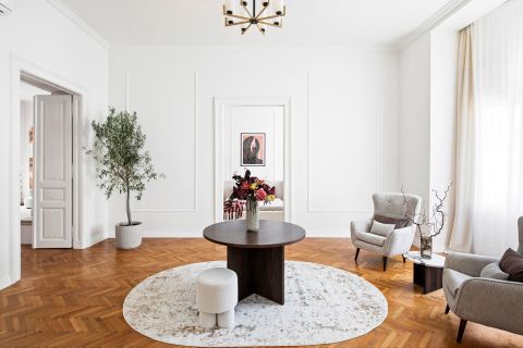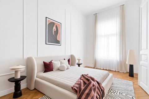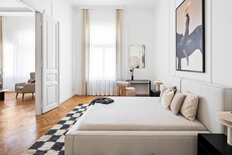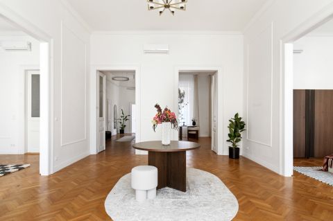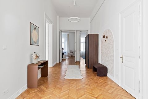 A nagy belmagasság, a gondosan felújított parketta és a finom stukkódíszítés elegáns, polgári atmoszférát teremt.