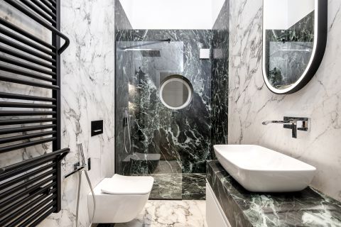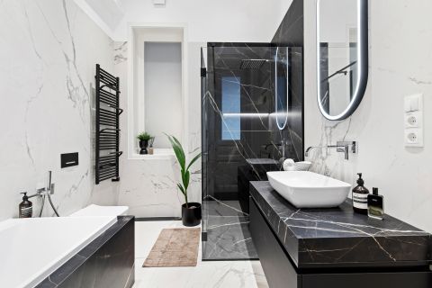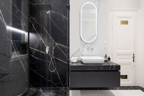 A lakásban három fürdőszoba található, amelyek kialakítása ötvözi a klasszikus eleganciát a korszerű megoldásokkal. Két teljes értékű fürdőszoba, valamint egy vendégmosdó szolgálja a kényelmet. Az egyik fürdőszoba tágas, káddal és zuhanyzóval egyaránt felszerelt – kompromisszumoktól mentesen –, míg a másik zuhanykabinos kialakítású. A kifinomult burkolatok és az időtálló szaniterek a minőségi otthon érzetét erősítik. Sötét, márványmintás burkolatok teszik egyedivé, és igazán elegánssá ezeket a helyiségeket.