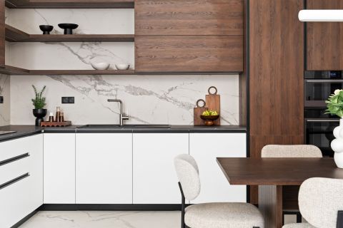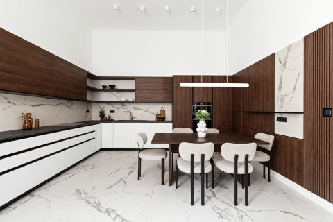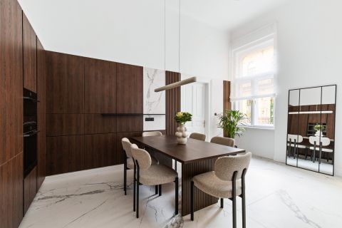 A nagy konyha külön helyiségben kapott helyet, így ideális lehet akár egy exkluzív konyha-étkező kialakítására is. A nagy ablakfelületeknek köszönhetően minden helyiség világos, a természetes fény pedig tovább növeli a tágas érzetet. Az elrendezés és a nagyobb munkafelületek révén kényelmesen használható, a klasszikus lakásokra jellemző praktikussággal kialakítva. A felújítás során modern stílusú bútorok kerültek beépítésre, melyek mégis harmonikusan illenek a nagypolgári hangulatot idéző térbe. Beépített sütő, mikrohullámú sütő, mosogatógép is a konyha része.