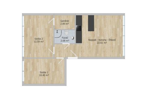 2 szoba (10,5 és 12,5 m2) jó elosztású és világos. A kisebbik hálószobának 2, míg a nagyobbiknak 4 ablaka néz az épület előtti parkosított területre. A nagyobb hálószobából nyílik a gardrób szoba, ami ideális tárolásra, de akár mosókonyhaként is használható, mivel rendelkezésre áll kiállás.