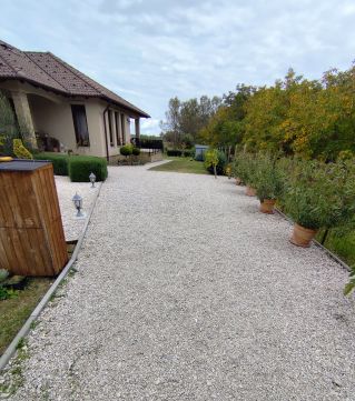 A hatalmas kert mediterrán növényekkel, frissen telepített gyümölcsfákkal, fúrt kúttal, akár egy medence kialakítására is alkalmas.
