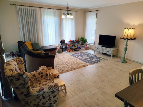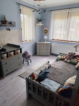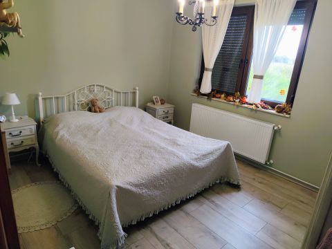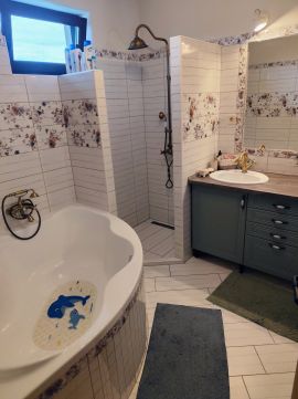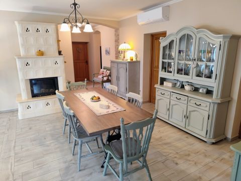 A déli tájolású nappaliban egy hangulatos, cserépkályhaként épített kandalló. Az épület fűtése vaillant kazánról nagyrészt padlófűtéssel szerelt, a három szoba radiátoros.