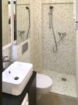 - A zuhanyzós fürdőszoba stílusos hidegburkolattal a többi helyiség laminált parkettával burkolt.