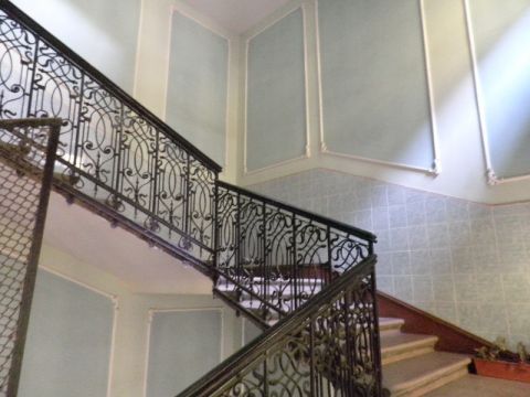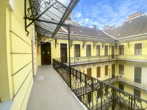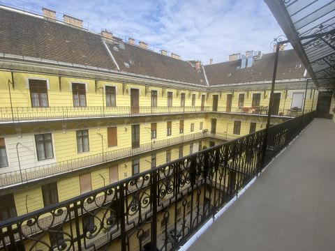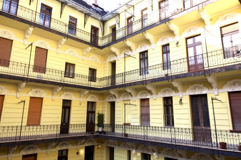 A lakás az épület 4.emeletén helyezkedik el. A liftből kilépve pár lépés után érjük el a lakás bejáratát. Addig is gyönyörködhetünk a belső udvar szépségében.