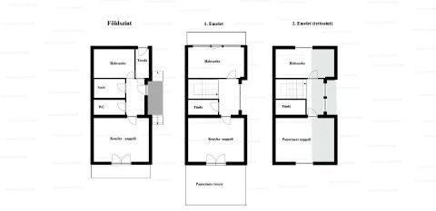 a másik külön bejáratú, emeleti és tetőtéri lakrész belső lépcsővel.