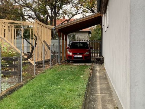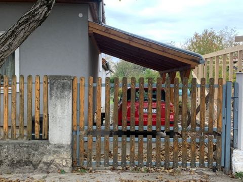 A kertben kialakításra került egy autó számára egy fedett kocsibeálló.