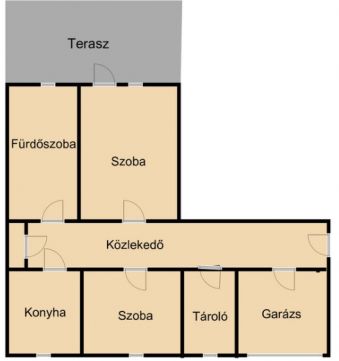 A bejáraton keresztül a közlekedőn keresztül jutunk be a lakásba. Balra egy garázs és tároló található, amely kívülről is megközelíthető. Az egyik szoba az utcára néz, mellette a konyha és étkező található. A tágas közlekedő végén egy kamra is elérhető.