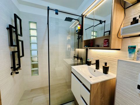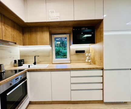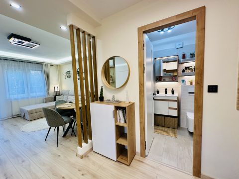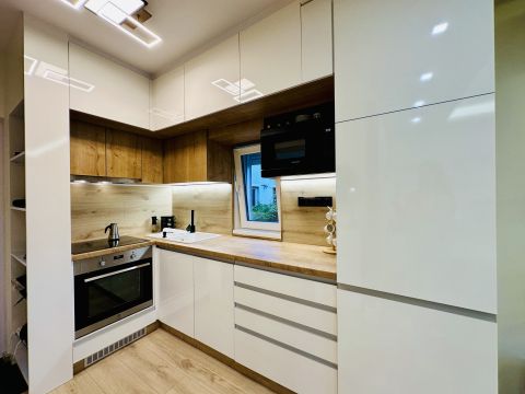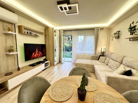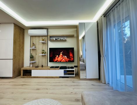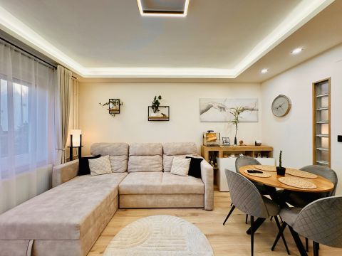 A lakás teljesen berendezve és gépesítve eladó – benne marad a kihúzható kanapéágy, étkezőasztal székekkel, beépített konyhabútor Electrolux gépekkel (indukciós főzőlap, sütő, hűtő), szekrények, valamint Midea hűtő-fűtő klíma és elektromos redőnyök is.
