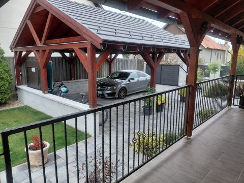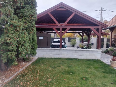 A kert végében 8 m²-es tároló / vállalkozásra is használható helyiség, az épület alatt 16,7 m²-es pince, a ház előtt pedig 2024-ben épült automata kapuval ellátott dupla autóbeálló és térkövezett parkoló található.