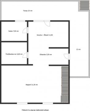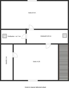 Földszint: előszoba, tágas nappali, konyha + étkező, hálószoba, fürdőszoba, lépcső alatti gardrób.