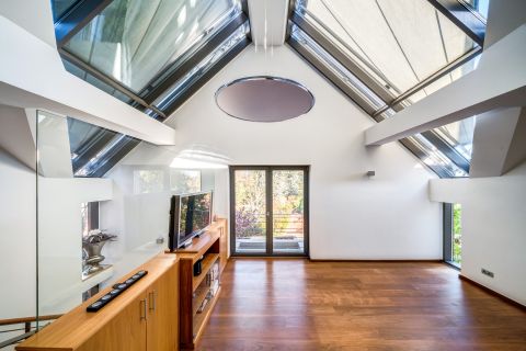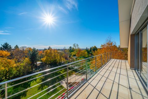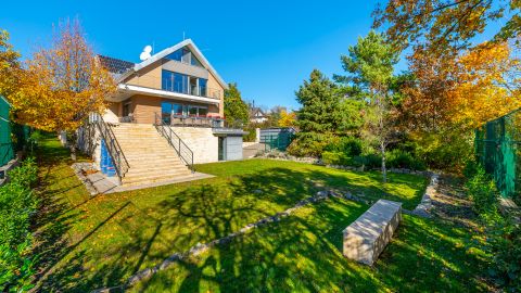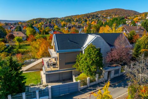 A XII. kerület erdőszegélyén, dombtetőn áll ez a 775 m²-es, négyszintes, déli tájolású családi villa egy ~2200 m²-es telken.