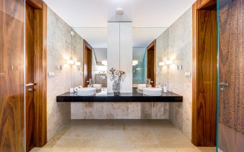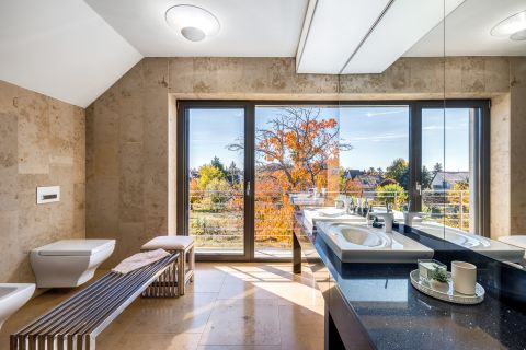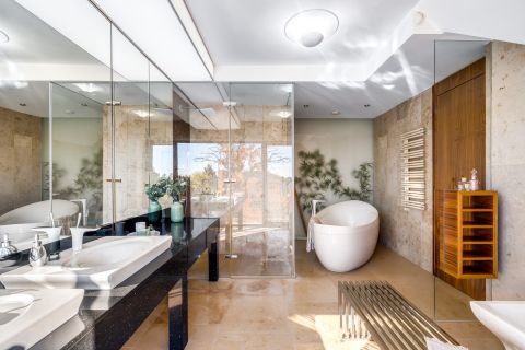 A szülői lakrész külön univerzum: kétoldali gardrób, privát terasz és szobaméretű, panorámás fürdő, ahol kő, fény és víz időtlen egységet alkot.