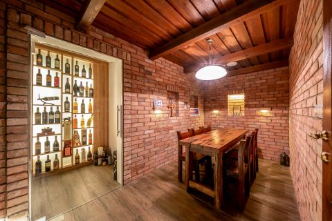 A borozó ajtaja és bútorzata Ázsiából származó, több mint százéves hajófa anyagból készült, eredeti viaszolt felülettel megőrizve.