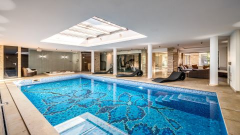 11 szoba, 5 fürdő, 3 külön mosdó, tágas közösségi zónák, privát wellness és fitneszterem; a kertben saját teniszpálya és kosárlabdapálya, reflektorvilágítással.
