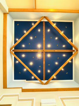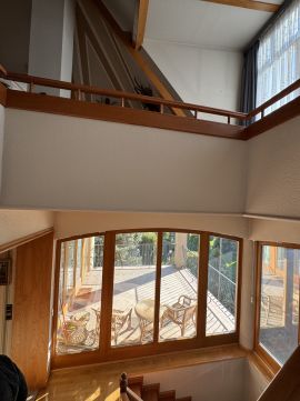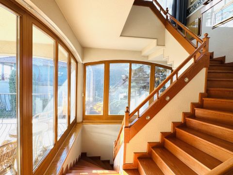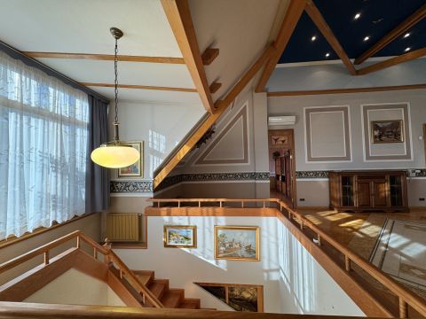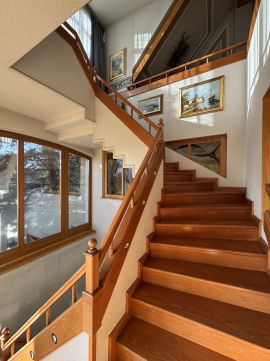 A faburkolatú, üvegkorlátos lépcsőháza ház egyik legszebb, látványos eleme.
