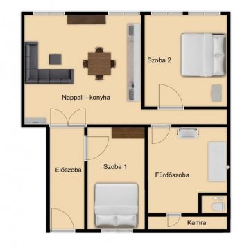 • 2 nagy szoba, amerikai konyhás nappali, kamra
