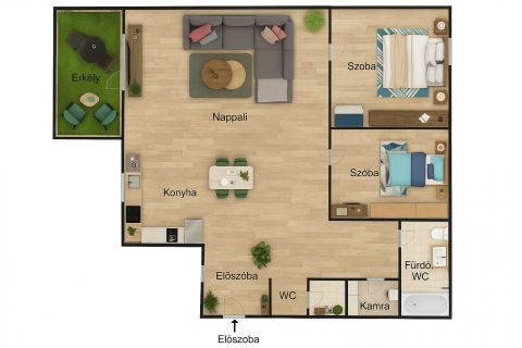 A lakás elrendezése praktikus és CSALÁDBARÁT: tágas, AMERIKAI KONYHÁS nappali, 2 hálószoba, KAMRA, fürdőszoba, külön vendég-WC.