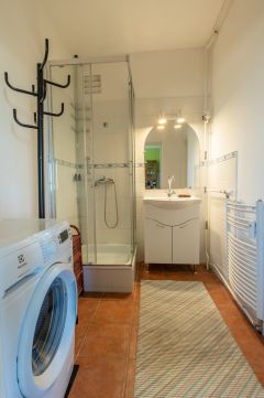 - A nappali és a hálószoba parkettával, a vizes helyiségek járólappal burkoltak.