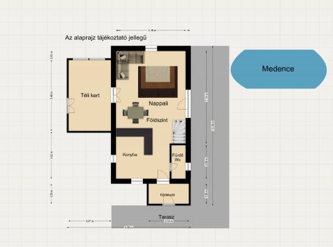 Innen nyíllik egy toalett kézmosóval, valamint innen tudunk kijutni a fűthető téli kertbe, és a hátsó kertre néző nagy teraszra. Valamint innen indul az emeletre vezető lécső.