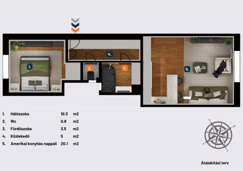 ✅ Jól szeparálható nappali és háló funkció, a praktikus konyha-étkező megoldással, ideális egyedülállóknak vagy pároknak, akár otthoni munkavégzéshez is.