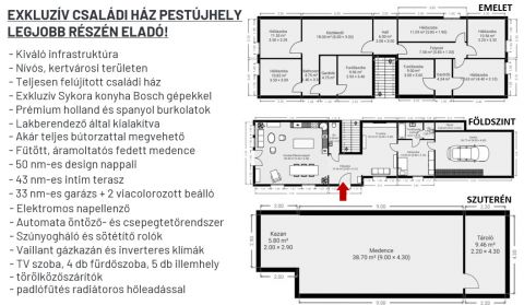 A FÖLDSZINT és az EMELET MODERN ÉS JÓL FELSZERELT lakótérként funkcionál, a SZUTERÉN szinten pedig kialakítottak egy WELLNESS RÉSZT: FEDETT, FŰTÖTT, ÁRAMOLTATÓS MEDENCÉT zuhanyzóval, szauna előkészítéssel és közvetlen kijárással a teraszra.