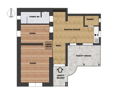 Szobákban laminált parketta, többi helyiségben járólap a padlóburkolat.