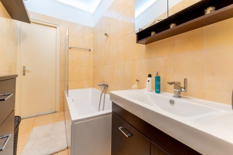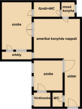 A lakás elosztása ideális és jól átgondolt: amerikai konyhás nappali étkezővel, két külön nyíló hálószoba, egy kádas fürdőszoba WC-vel, egy zuhanyzós fürdőszoba, külön WC, előszoba és háztartási helyiség található benne. Az ingatlanhoz tartozik egy 4 m²-es erkély, valamint egy 4 m²-es, zárható pincei tároló is.