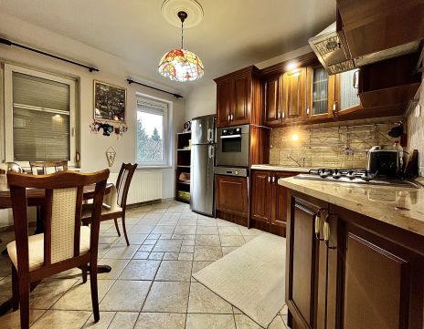 Az ingatlan belső világa, berendezési tárgyai és 'otthon érzete' csak fokozódik a masszázskáddal, a klasszikus korszakot idéző tömörfa-smaragd nappali bútorzattal és a konyha mélybarna színvilágával.