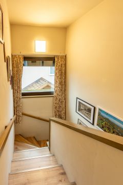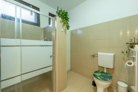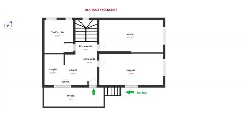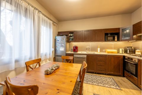 70m2-es a földszint, nagy étkezős konyhával, nappalival, hálóval, kényelmes méretű fürdőszobával.