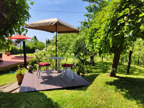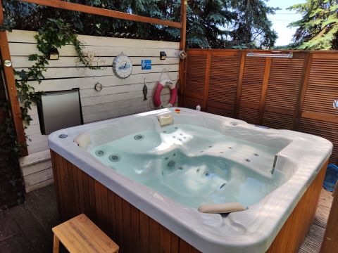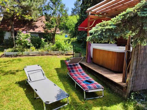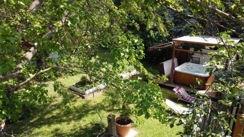 Az udvar teljesen körbe van kerítve, olyan mint egy oázis, reggel a domboldalról, estefelé pedig a Balatontól érkezik a tiszta levegő. Ha relaxálni lenne kedve itt minden adott, a jakuzzival együtt.