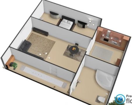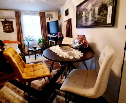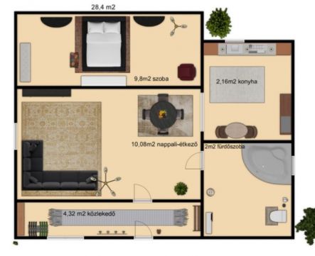Helyiségek: közlekedő, nappali-étkező, konyha, fürdőszoba, szoba.