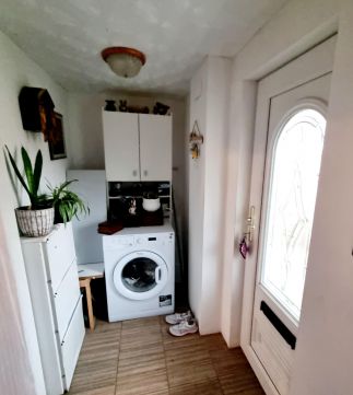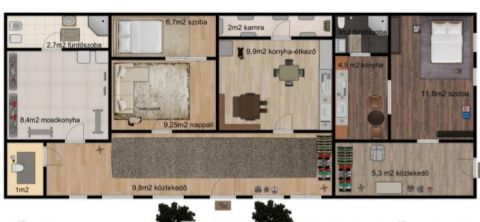 1. rész (49,75 m2): Közlekedő, WC, mosókonyha, fürdőszoba-WC, konyha-étkező, kamra, nappali, szoba