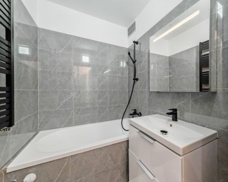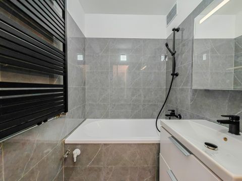 A fürdőszoba (külön Wc-vel) modern, kényelmes kialakítású, a távfűtés pedig egyedi mérés alapján működik, így a fűtési költségek is optimálisan tervezhetők. A klímaberendezések gondoskodnak arról, hogy a nyári hőségben is kellemes hőmérséklet fogadjon.