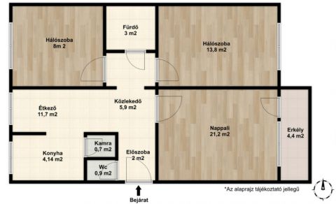 - Nappali, erkély, hálószoba, hálószoba, konyha, étkező, fürdőszoba, toalett, kamra, előszoba, közlekedő