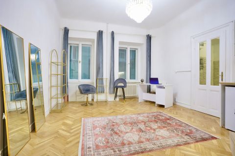 A társasházzal szemben kávéház reggeliző és étterem, számos üzlettel és szolgáltatással, bankfiók, posta is található. Budapest egyik legszebb parkja, a Károlyi kert a szomszéd utcában,1-2 perc séta távolságon belül. A Dunapart pár perc séta, közlekedés szempontjából a 3-as metró, a 2-es villamos és a legtöbb belvárosi busz elérhető. A lakás elhelyezkedése egyedülálló: a csend és a belvárosi pezsgés tökéletes harmóniája. A város minden pontja gyorsan és kényelmesen elérhető.