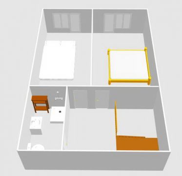Elosztását tekintve az alsó szinten egy nappali-konyha-étkező található közvetlen terasz kapcsolattal, valamint egy vendég mosdó, míg az emeleten egy fürdőszoba és két, erkélyes hálószoba került kialakításra.