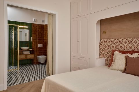 A szülői háló intimebb helyre került, távolabb a központi terektől. Üvegajtós átjárón keresztül vezet a saját fürdőszobába, ahol a len függöny lágyítja a fényt és megtöri a felületek feszességét. Az ágy fejtámlája angol szövetből készült, a két oldalsó olvasólámpa pedig kifejezetten a pihenés kényelmét szolgálja. A szoba olyan hangulatot áraszt, amely egyszerre csendes, elegáns és időtlen.