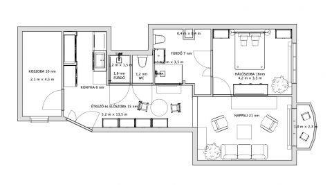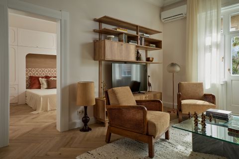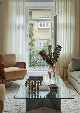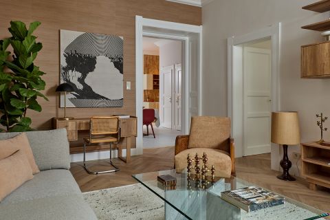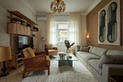 A nappali déli irányból kapja a fényt, így egész nap meleg tónusok járják át a teret. A felújításnál tudatos koncepció szerint válogatták össze a bútorokat és tárgyakat: Breuer Marcell szék hoz markáns, ikonikus jelenlétet, Török János keramikus padlóvázája szoborszerű, mégis otthonos eleme a helyiségnek, a klasszikus márvány dohányzóasztal pedig finom eleganciát ad a nappali közepének. A háttérben álló, Angliából származó, 1960-as évekből fennmaradt eredeti komód olyan darab, amely önmagában is időtlen karaktert hordoz.