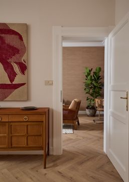 Ez a lakás nem egyszerűen felújított ingatlan — sokkal inkább egy művészien összeállított tartalmi egység, ahol a múlt értékei és a kortárs szemlélet egyetlen, harmonikus történetté állnak össze.