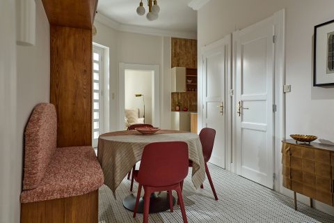 Belépés után egy tágas előtér nyitja meg a lakás hangulatát: a méretre készült fa előszobabútor és az itt kialakított étkező természetes átmenetet ad a közösségi és privát zónák között. A frissen gyártott fa nyílászárók az eredeti polgári ablakok karakterét idézik, így a felújítás egyszerre tiszteleg a ház múltja előtt és teremti meg a modern érzést.