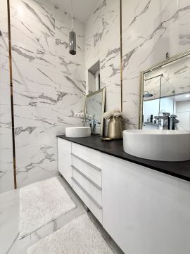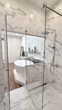 A lakás különlegessége a szabadon álló designkád, a walk-in zuhany.