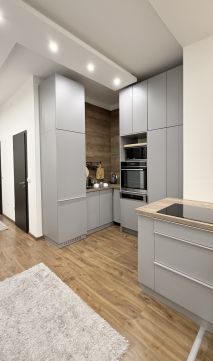 Letisztult szürke frontok, fa hatású hátfal és rengeteg pakolóhely teszi igazán praktikussá.